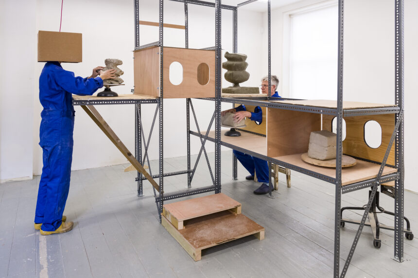 flocking on jesmonite, vintage brown bowler hat, steel.
