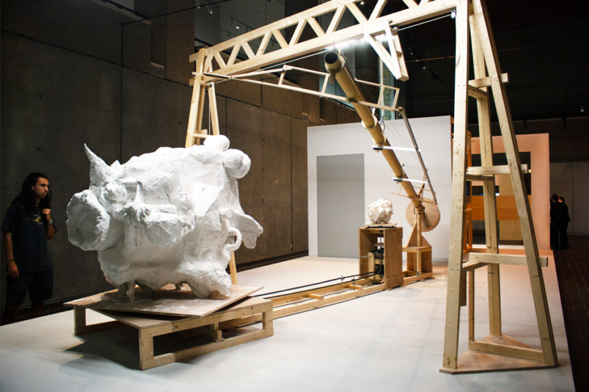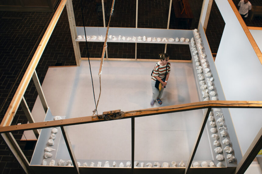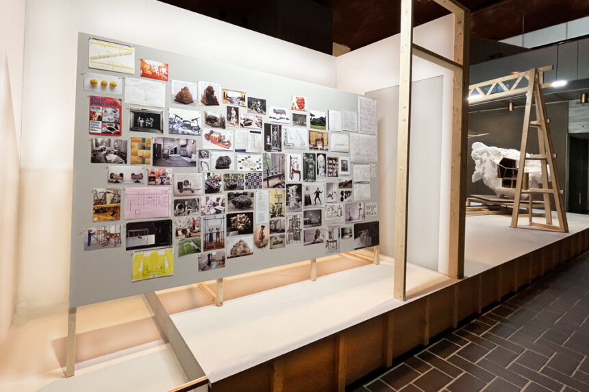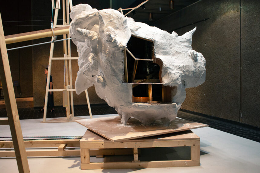 Designed by Mayekawa Kunio in 1975 the Museum’s sculpture gallery is a cavernous modernist space with distinctive hand hammered concrete walls. Noting that their ground floor sculpture studio and workshop in London would fit into this imposing and challenging gallery Dunhill and O’Brien decided to construct a life-size (1:1) platform and structure based on the dimensions of their studio for the exhibition. In this way they created their own making space independent of the gallery that could also act as a ‘raft’ and plinth.