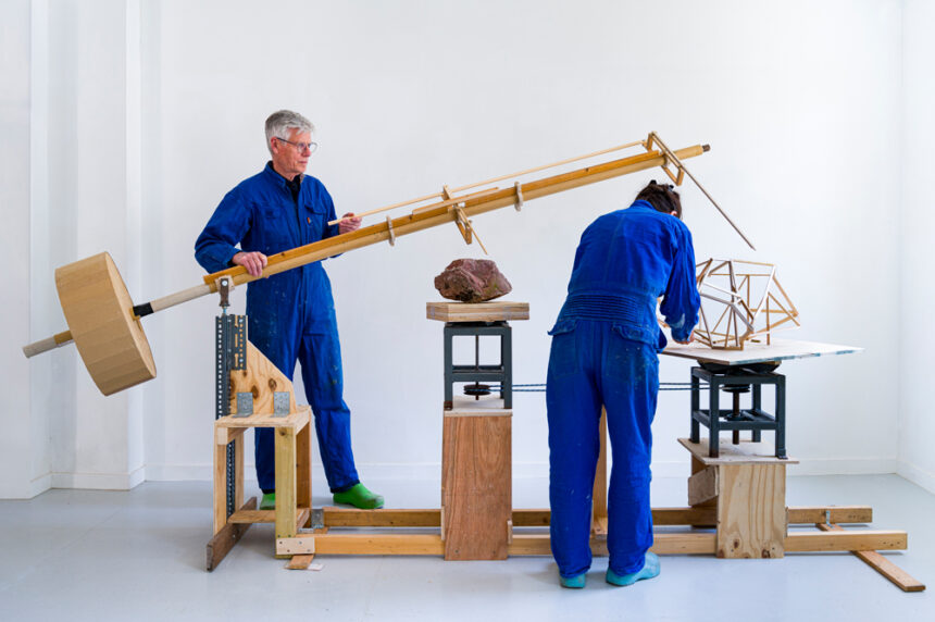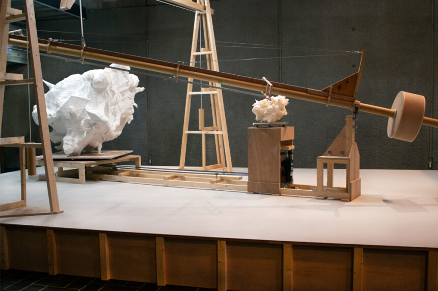 Following the elaborate process involving many acts of interpretation they used this home-made device, loosely based on a 19th Century Sculptors’ tool. Over a 5-day period Dunhill and O’Brien plotted and enlarged the ‘mash-up’ to a scale closer to Mogami’s sculpture employing traditional techniques and materials (wood armature, plaster, scrim etc) to produce a new work.