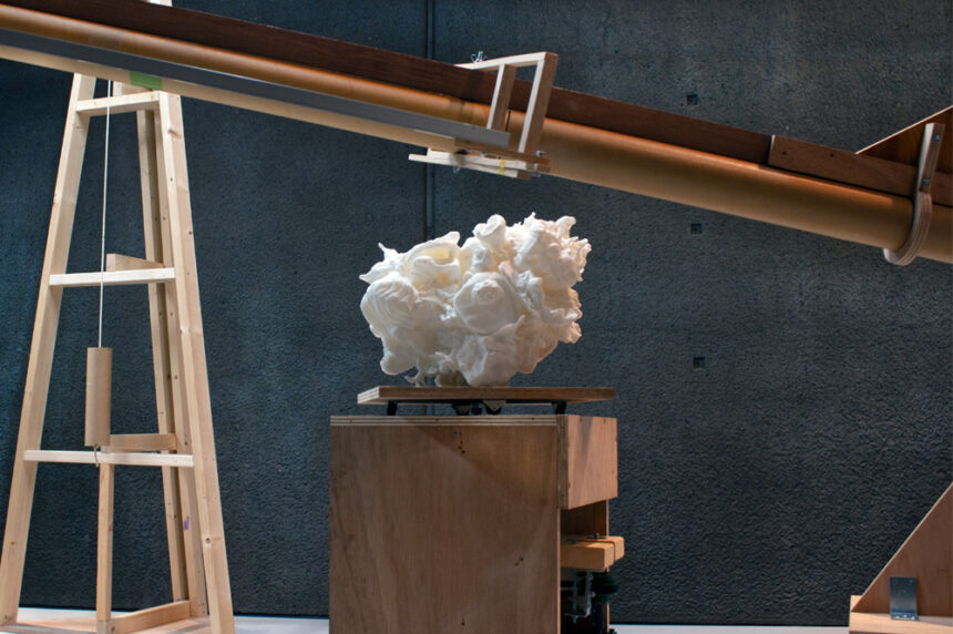 The installation comprised of the platform with framed wall structures, the large-scale plaster sculpture on a motorised turntable attached via a chain and motor to the ‘mash-up’ on a smaller turntable; the 5.5 metre long 3D pantograph with its 3.5 metre high wooden gantry; a 3.33 minute subtitle video of the descriptive text; the library of over one hundred 3D printed forms; and a pin board documenting visual research and references.